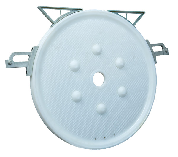 2、濾腔進料孔附近均勻設(shè)有4只支撐柱,濾板成型后,整體強度加大,延長使用壽命,濾餅直徑放大10mm, 確保產(chǎn)量不變;
