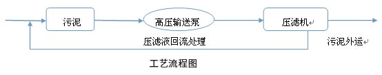 電鍍廢水處理所產生的污泥,直接經過高壓輸送泵輸送至壓濾機,經過高壓過濾壓榨脫水直接實現電鍍污泥高效脫水;經過脫水污泥,污泥直接外運給有資質單位處理或重新提煉,壓濾機出水在回流至電鍍廢水處理站處理,若水質經調制達標可直接排放。