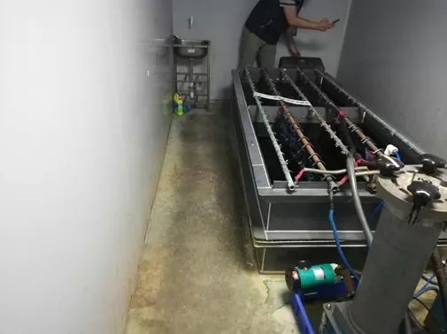 檢查發現,該作坊主要從事五金電鍍業務,現場未能提供工商營業執照,也沒有相關環保審批、驗收手續。該電鍍作坊是一間置于民房天臺的單層活動板房,有黑色網布遮掩,板房的加工區域設有三重門禁,電鍍工序設置在最內層的密室中。執法人員進入密室后,發現兩條正在工作的電鍍槽。
