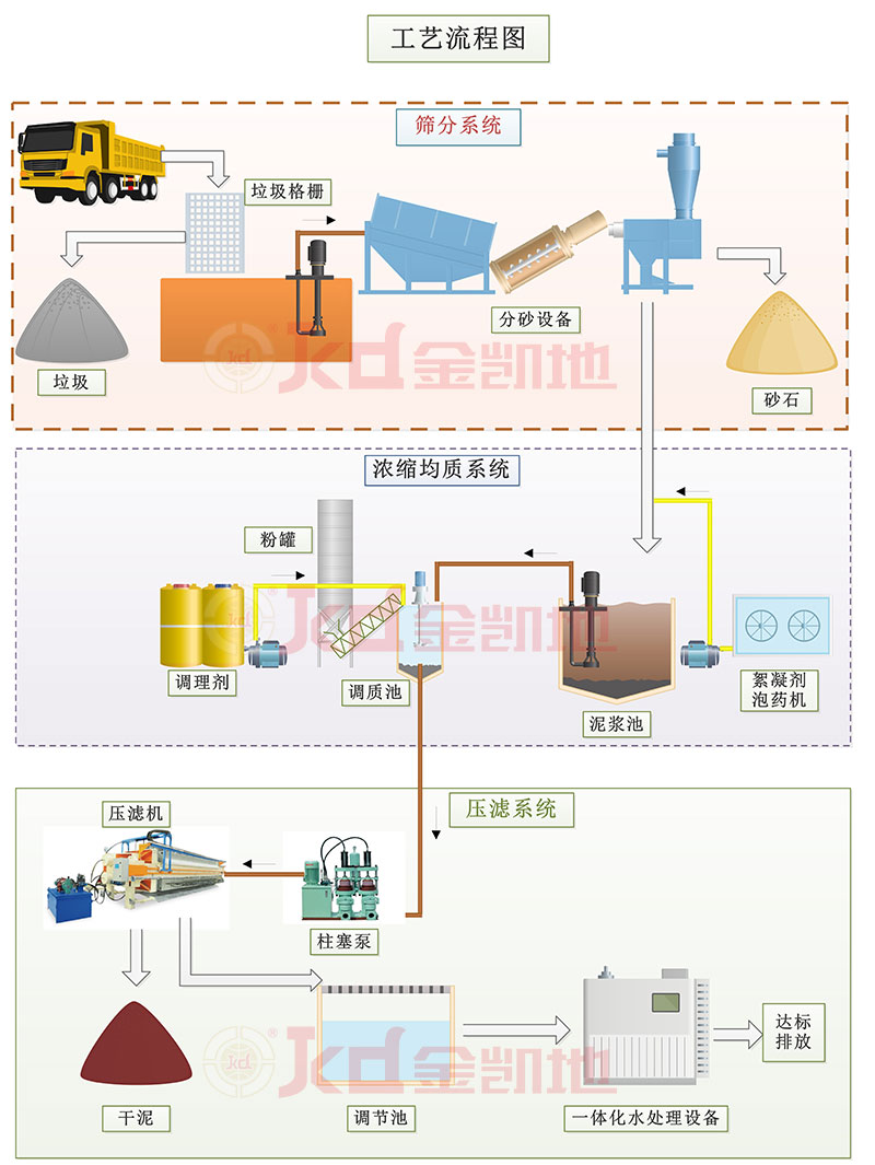 針對河道污泥特點,工藝方案需以泥樣分析實驗為基礎,設計一系列的流程解決相關(guān)問題。同時方案也和河道清淤方式相關(guān),如采用絞吸船清淤,則污泥含水率較大,需比較大的泥漿池儲存和濃縮污泥。如采用挖掘機清淤,則污泥含水率小,但含有的垃圾砂石較多,需采用對應的分離清楚設備和工藝。以下為我司設計的常規(guī)處理工藝: