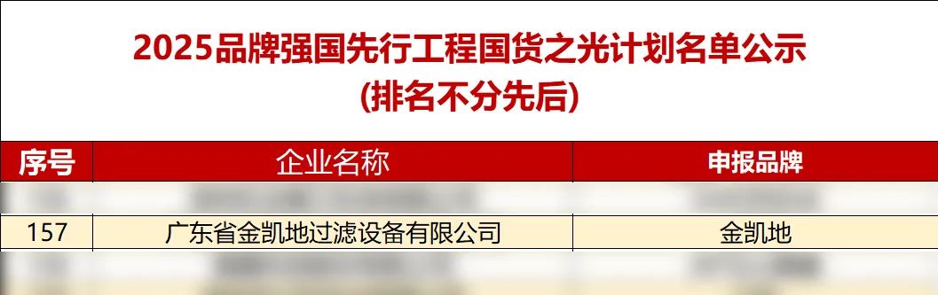 2025年1月,在“品牌強國先行工程”的嚴苛篩選中,廣東省金凱地過濾設備有限公司從申報企業(yè)中脫穎而出,榮登“國貨之光計劃”權(quán)威名單!這一由國家工業(yè)和信息化部指導、《中國工業(yè)報》聯(lián)合權(quán)威機構(gòu)評定的榮譽,僅授予200家代表新質(zhì)生產(chǎn)力與高質(zhì)量發(fā)展的民族品牌。金凱地憑借技術(shù)硬實力與行業(yè)影響力成功入選,彰顯中國高端裝備制造的全球競爭力。
