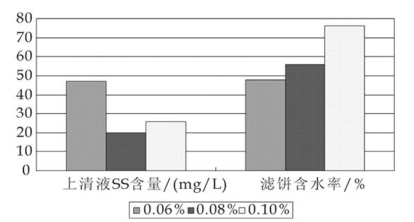 (3)藥劑投加量:本次試驗使用廠家提供的助濾劑,主要成分為石灰。在試驗中根據(jù)進料懸浮物含量,調(diào)整了助濾劑的投加比例,控制在0.06%—0.20%之間。分析數(shù)據(jù)顯示同一工況下,助濾劑投 加量對板框式壓濾機上清液懸浮物含量沒有明顯影響,對濾餅含水率有影響,且成正比,即藥劑的投加量少時,濾餅含水率低;藥劑的投加量多時,濾餅含水率相對比較高;但不投加藥劑時,濾布上粘連的污泥較多,不易脫落,操作難度大,影響濾布的使用壽命。3種工況下,當(dāng)進料懸浮物高時,藥劑單耗 高。