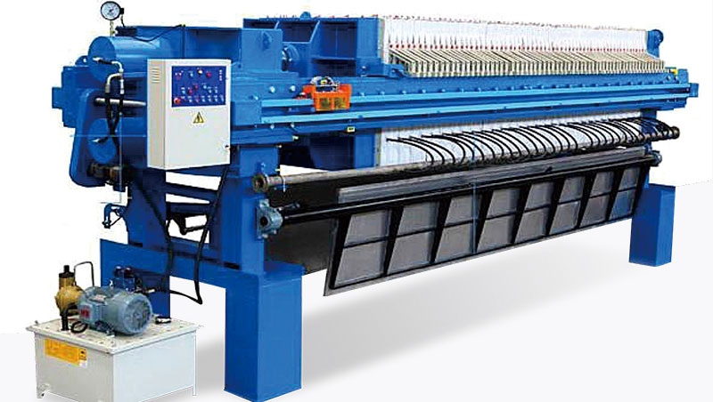 隔膜壓濾機是由隔膜濾板(隔膜濾板是由兩片聚丙烯膜片與高強度聚丙烯蕊板熱融合而成)和廂式濾板排列組成濾室,在輸料泵的壓力作用下將料漿輸入濾室,通過濾布將料漿中的固體和液體分離,當料漿中的固體形成餅后,再向隔膜濾腔注入適當壓力空氣,對濾室內的固體充分壓榨,降低含水率。尤其對于粘性物料的過濾及對含水率要求高的用戶,此機更有其獨特的特性。